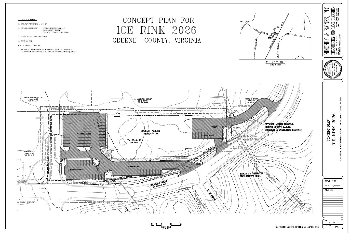 “The Ice Park Facility is planned to be approximately 32,000 SF with a seating capacity of about 200 seats,” reads the narrative for the project which has the title Ice Rink 2026. “There will be onsite parking with two vehicular access points: Deerfield Drive and the Shopping Center access road.”
