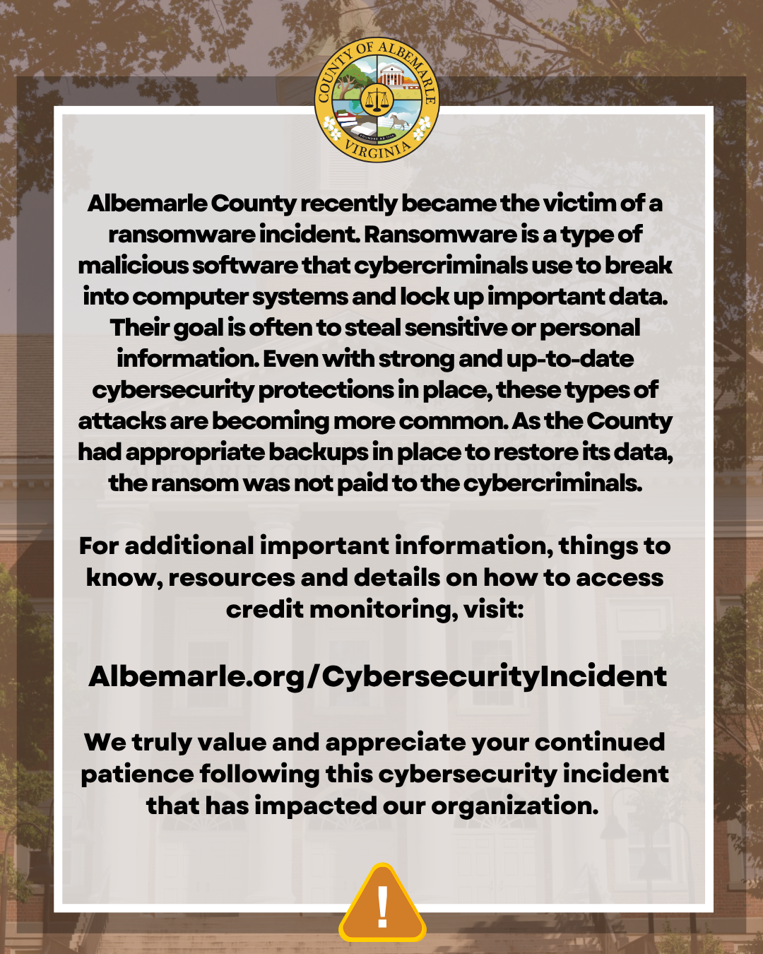 “To provide peace of mind, and because trust is the foundation of everything we do, we are offering free credit monitoring and identity protection resources to our constituents and employees,” said Jeff Richardson, Albemarle County Executive. “We recognize how important personal information is and take our responsibility to protect it seriously.”