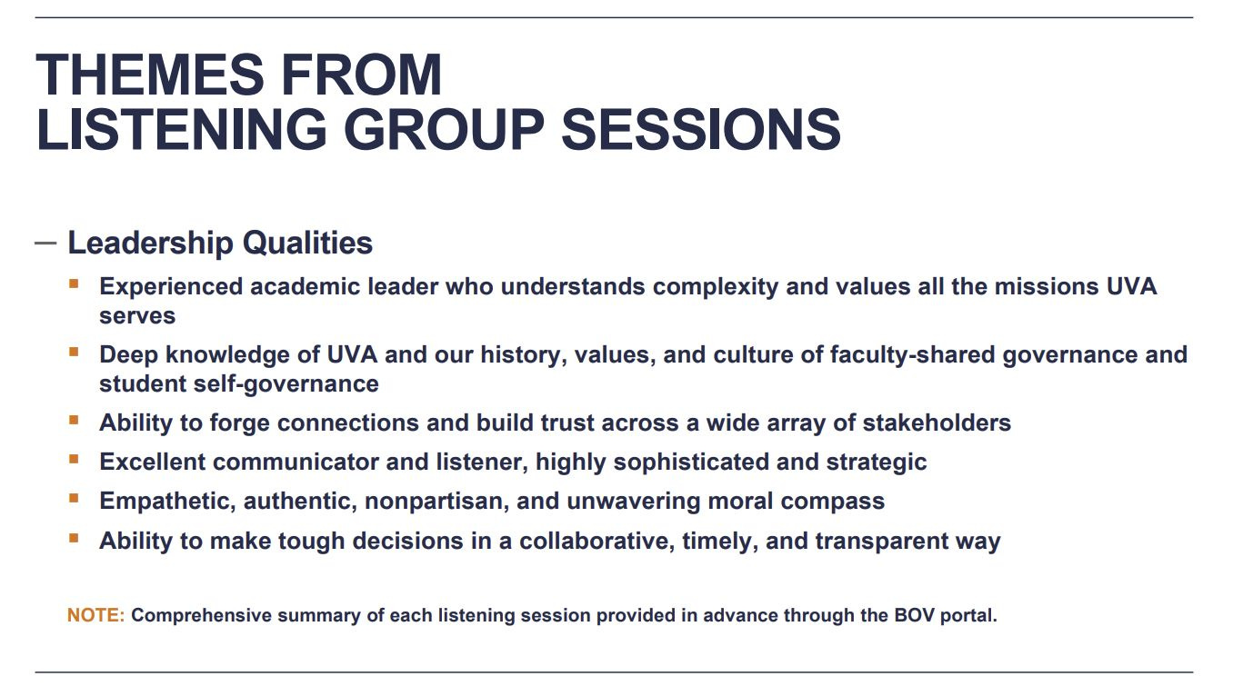 Since Ryan resigned, the American Association of University Professors at the University of Virginia have expressed concern through a series of letters. On July 28, they sent a letter decrying what they see as a lack of input from staff on the search committees for both the interim president and the 10th president. They want the Faculty Senate to play more of a role.
