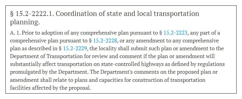 The report notes that there will be a “meaningful” cost to conduct the studies which would ostensibly satisfy a section of Virginia Code which states a “locality shall submit the proposal to the Department of Transportation within 10 business days of receipt thereof if the proposal will substantially affect transportation on state-controlled highways.”