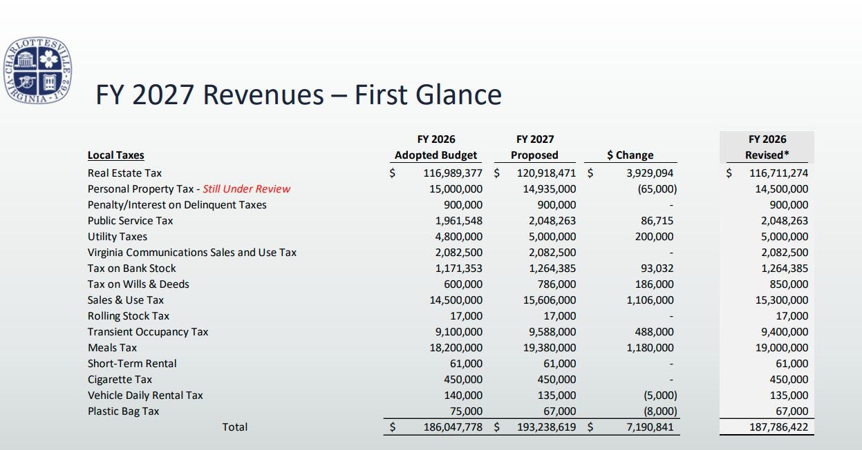 There are just under four weeks until Charlottesville City Manager Sam Sanders presents his recommended budget for fiscal year 2027. The five people who will make changes and then adopt their version got a briefing on where things stand on January 29, 2026.